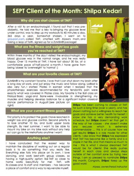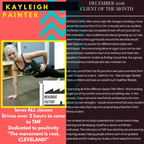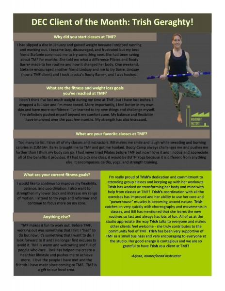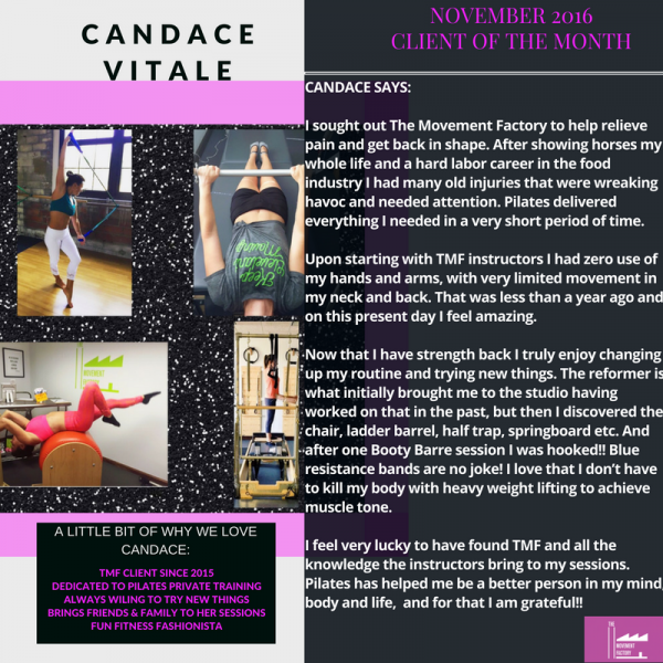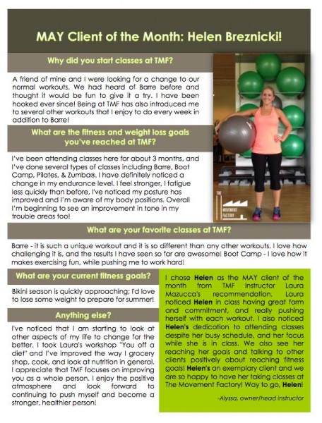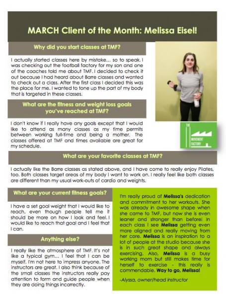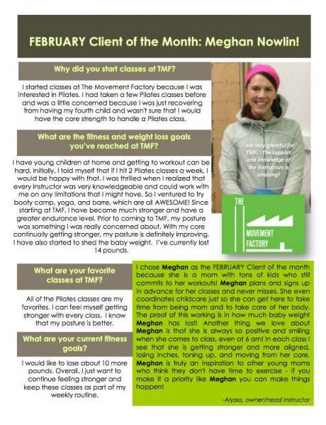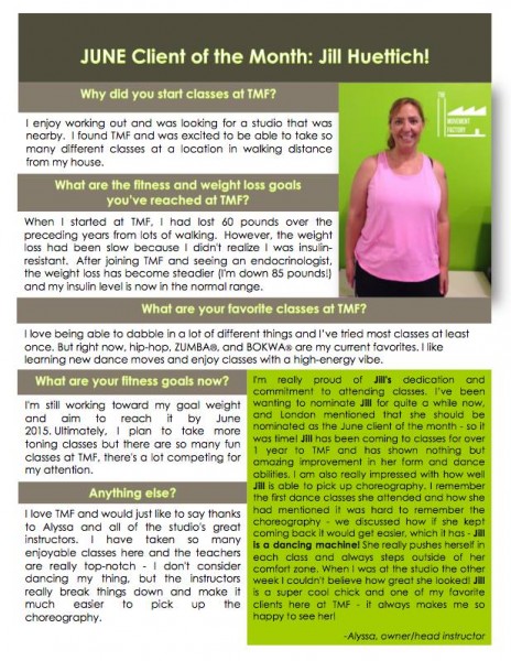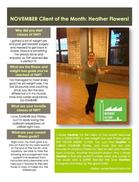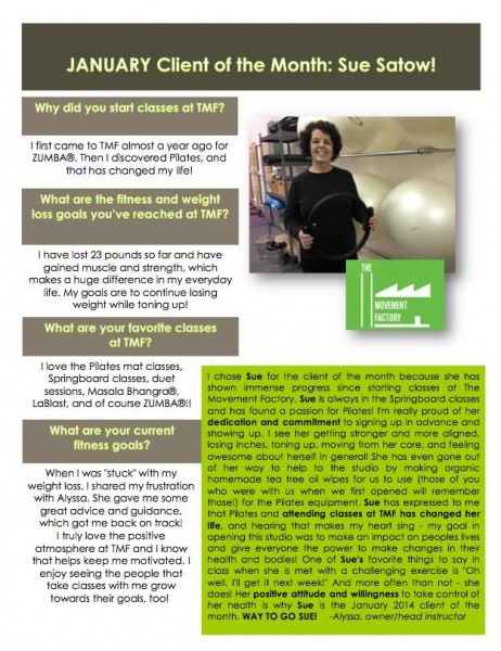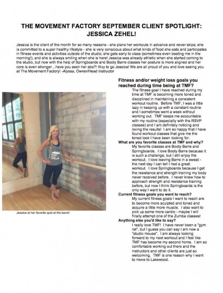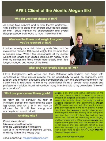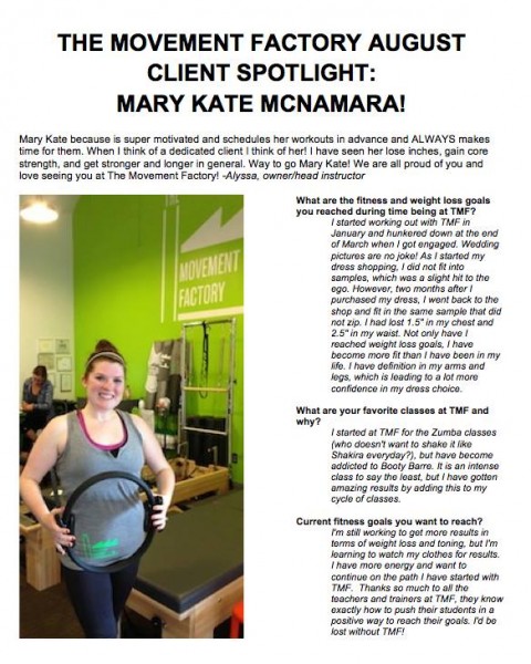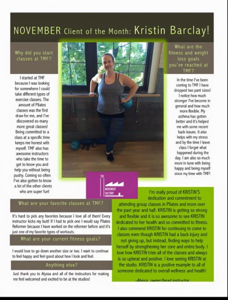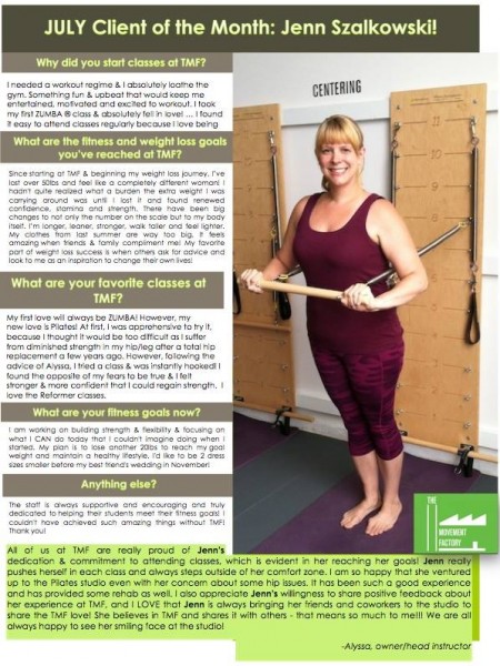 "...I just want to thank you for all your hard work and your amazing studio! TMF has really been life changing for me! I have lost over 45lbs in the past 5 months and I have the work I am putting in at TMF to thank for a lot of that! I never knew exercise could be so fun and addicting...I actually want to workout and crave it when I miss a class! All of your instructors and staff are friendly, encouraging and supportive! You are doing an amazing job and helping countless people, just like me, take back control of their bodies and their lives. You should be very proud of yourself and your accomplishments. You rock! A million times, thank you!" -J.S., Pilates client, 2014