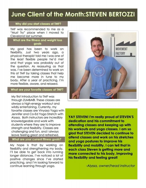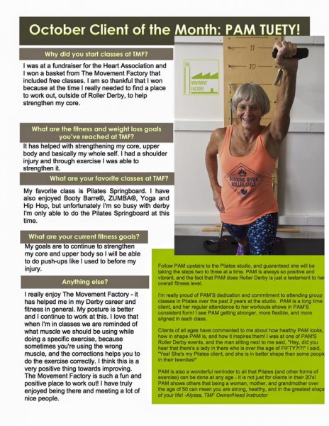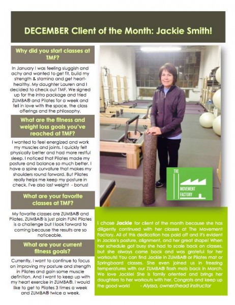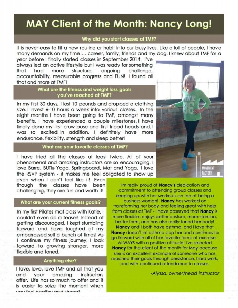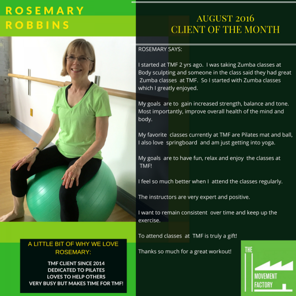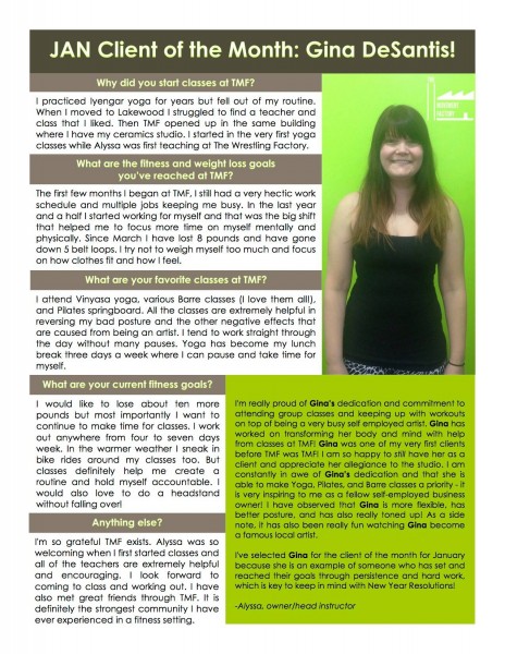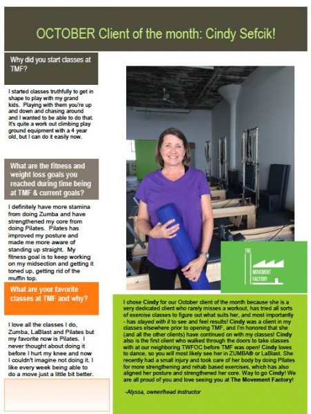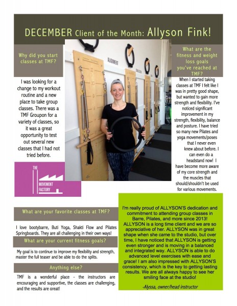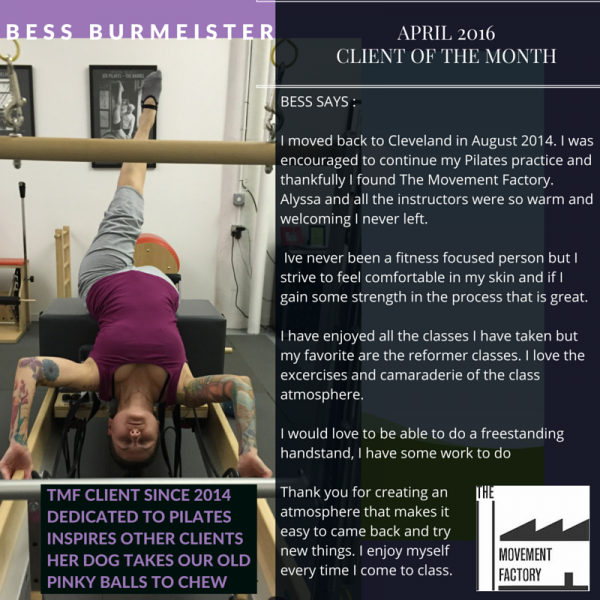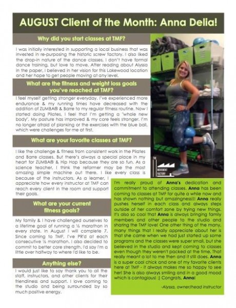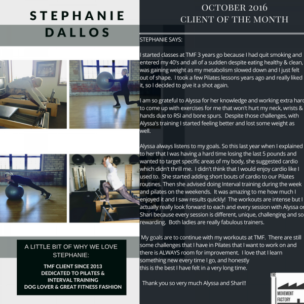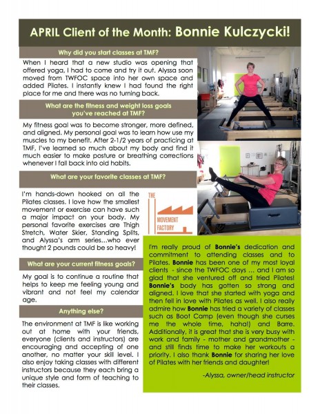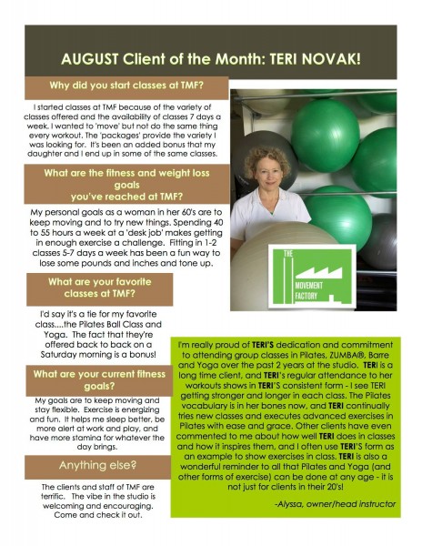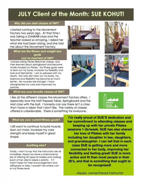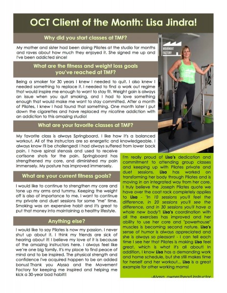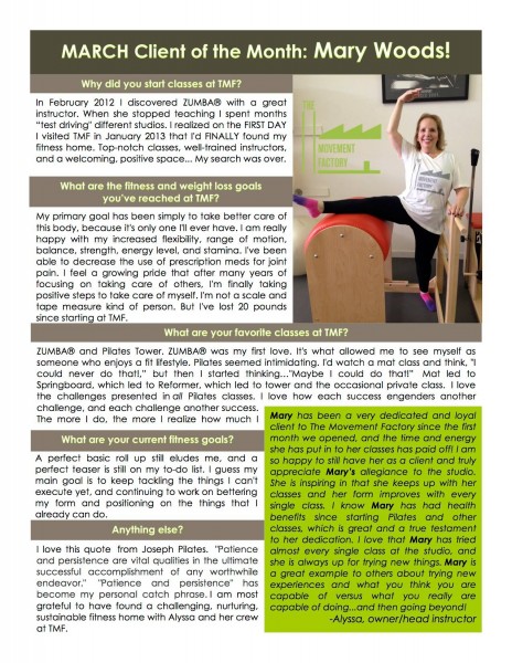 "... TMF is a huge part of my normal! I just can't tell you how much it has come to mean to me over the past two years. Thank you for your approach of bringing Pilates to everyone! When I started with you, I weighed 25 pounds more than now. While in still hope to loose a few more pounds, I am so much more comfortable with myself now! Your guidance and kindness have encouraged me along the way! I will also say that while I love all my classes at TMF with all of the great instructors, there's nothing like an Alyssa class" -S.S., Pilates client, 2015