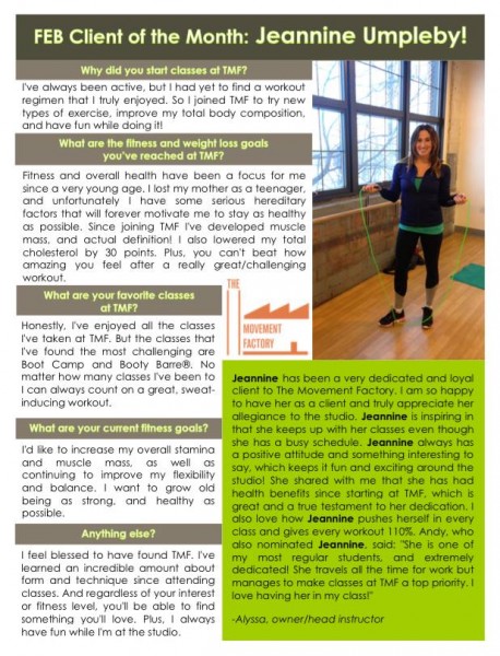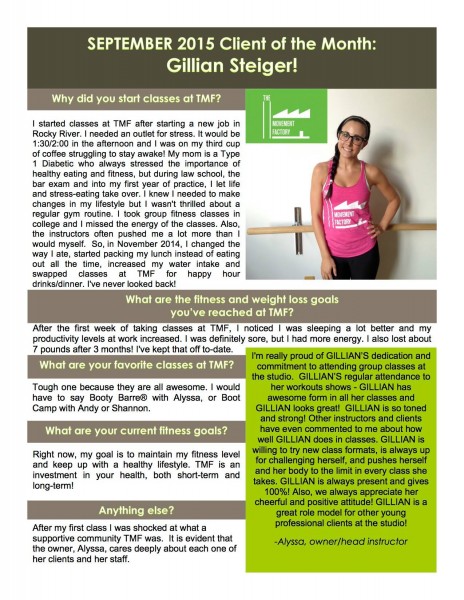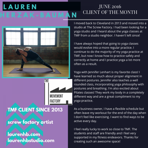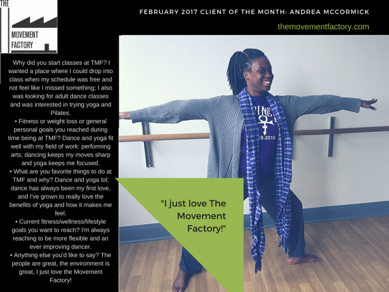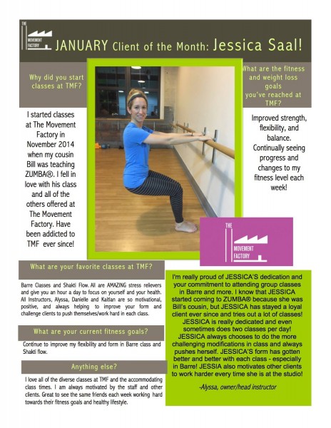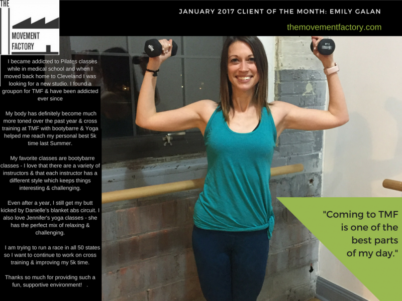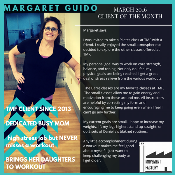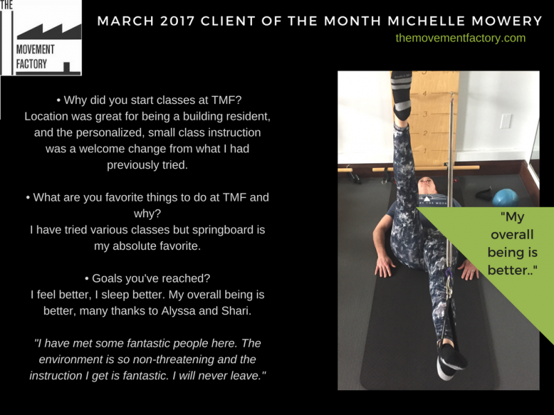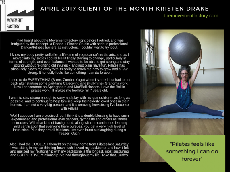 "One of the many reasons I love going to classes at the Movement Factory is because everyone there is so friendly and welcoming! Thank you for providing a space that I can have fun and make friends while working out!" - M. B.S., Pilates client, 2015