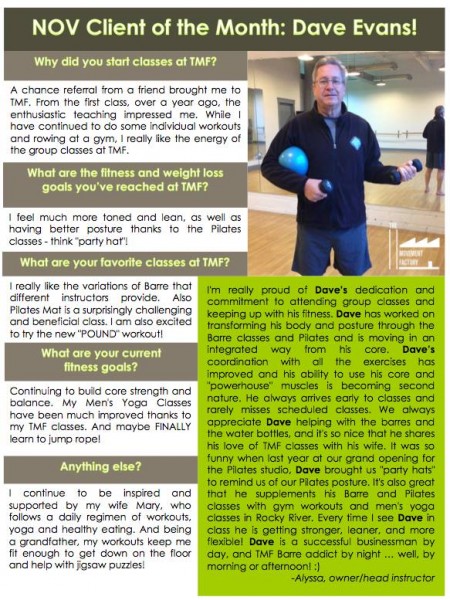 "You continue to go above and beyond and it's noticed. I'm amazed by your effort, understanding, and patience. I can't think of another owner who would take the time to listen, respond, and then implement the requests of their clients. TMF is one of a kind." - T.G., Pilates client, 2014