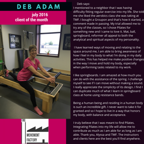 "I LOVE springboard and mat/ball Pilates - I know that there is nothing like it [The Movement Factory] elsewhere." - B.S., Pilates client, 2015